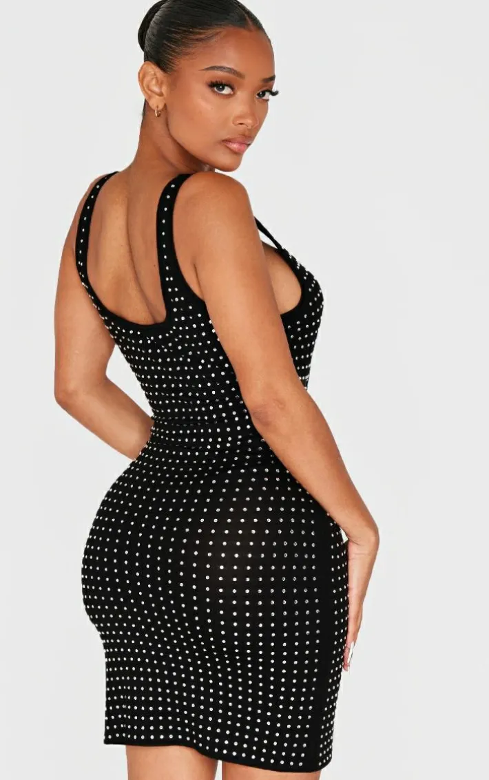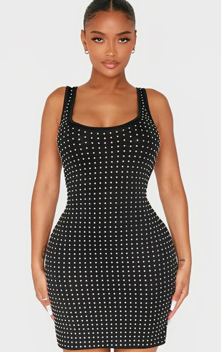 Show off your shape with this shape black hot fix scoop neck mini dress. Brought to you in a black hot fix material with a scoop neck design and a mini length, all eyes are sure to be on you. Team with a pair of court heels and your fave accessories for a look like no other. It’s a yes from us.