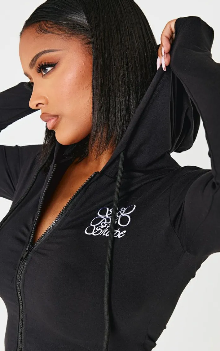 Enter the new season in style with this shape black logo zip through top. Brought to you in a versatile black hue, with a logo design and zip through feature, we know you’ll be feeling your most confident. Style with the matching bottoms and a pair of clear heels for a fool proof finish.