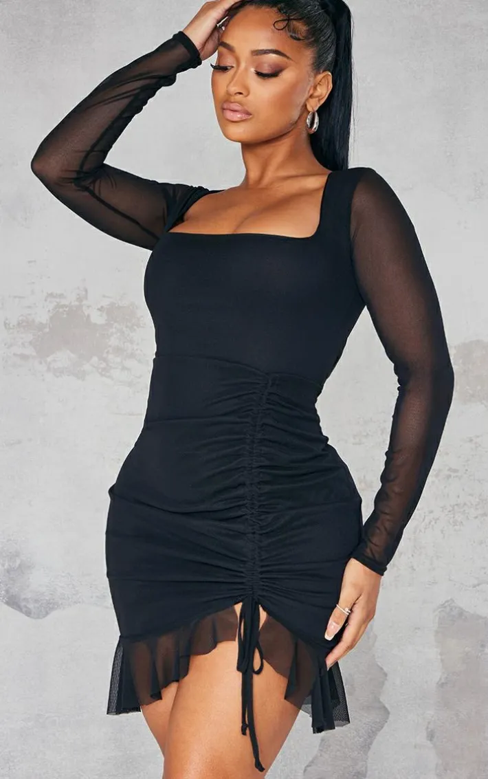 Got an important occasion pencilled into your diary? Then this shape black long sleeve mesh ruched side frill hem bodycon dress. Brought to you in a black mesh material with a long sleeve design and a ruched side, you’ll be taping into your feminine side no matter what. With a hem detail and a bodycon fit, this dress is the ultimate must have in your collection. Team this little black dress with some of your fave accessories and a pair of heels for a look we are loving.