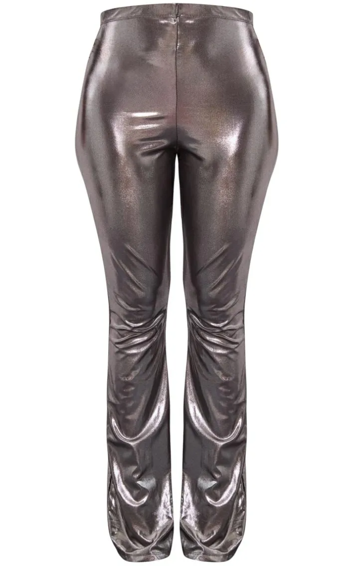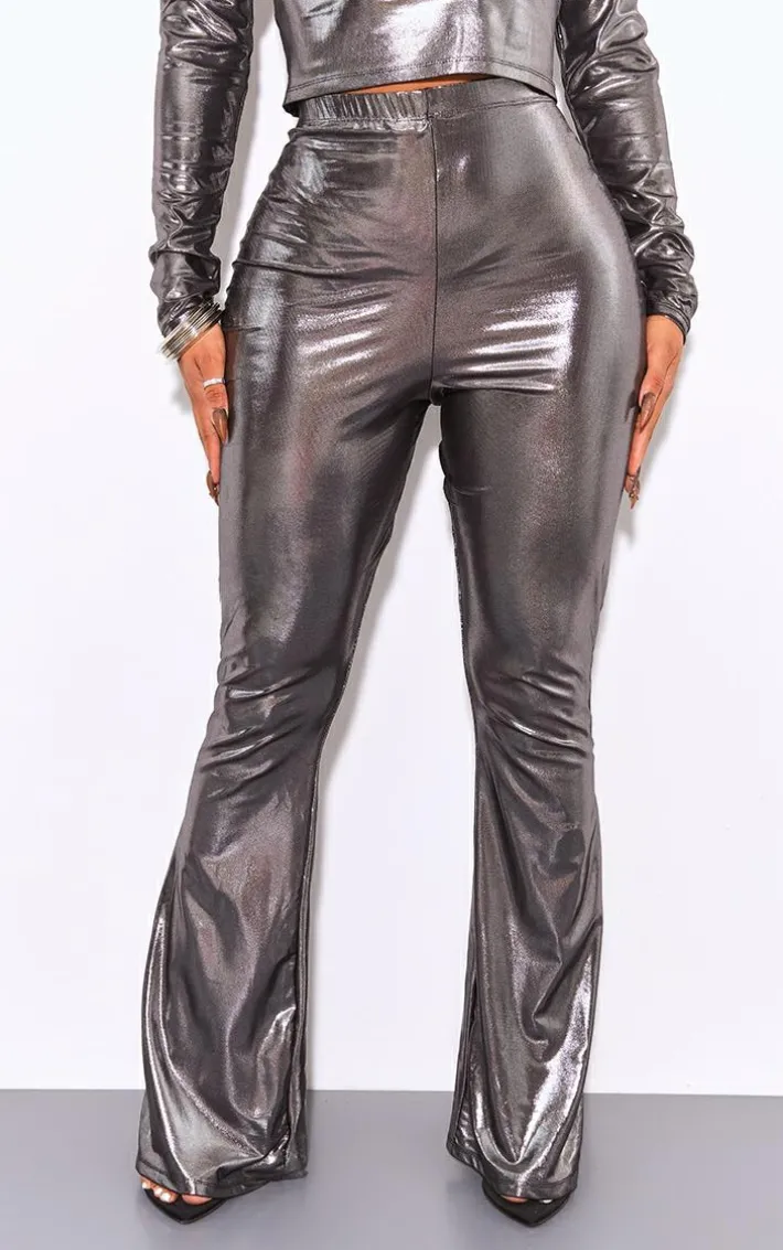 When the weekend calls for a little drama these shape black metallic flare pants will have you at the center of attention. It is made using a black metallic material with a flared leg, what more could you want ? Style these with the matching top clear slip-on heels and statement accessories to elevate the look further