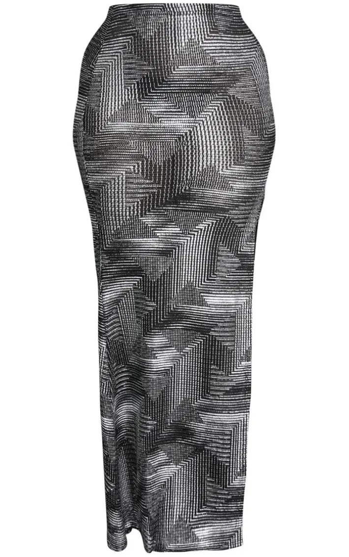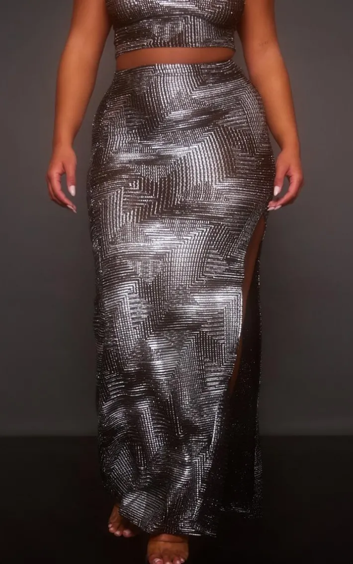 When the weekend calls so does this shape black metallic textured split side maxi skirt. Made from a black metallic textured material with a split side design and a figure-flattering fit, what’s not to love? This shape maxi skirt brings all the fresh feels to your look as well as adding some glam vibes. Simply add the matching top, silver accessories and clear heels for a statement finish.