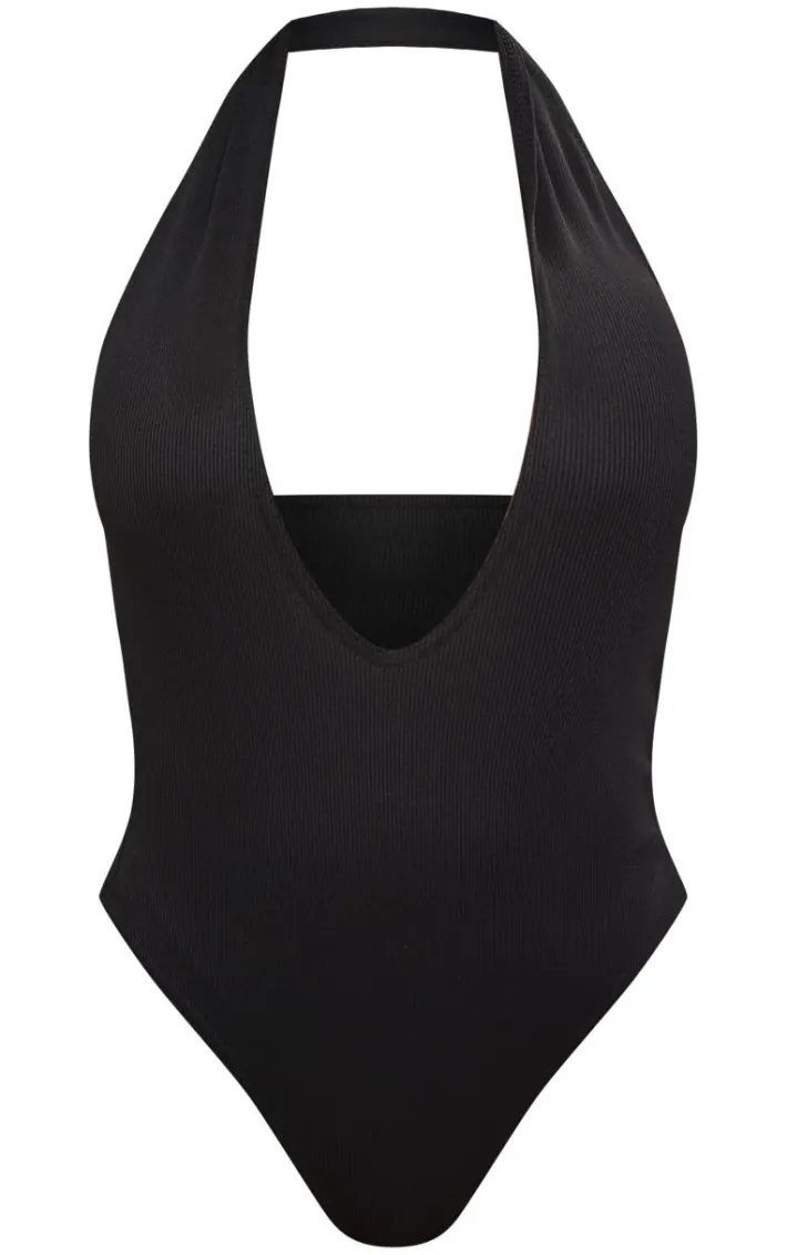 Steal all the stares in this shape black ribbed halterneck plunge bodysuit. Brought to you in a black ribbed material with a halterneck design and plunge detail, this bodysuit is calling your name. Style with black jeans, heels and statement accessories to turn heads for all the right reasons.