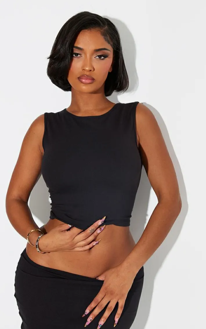 Your new season wardrobe is calling out for this shape black sculpted longline racer top. Brought to you in a black sculpted longline racer top. Brought to you in a black sculpted material with a longline fit and a racer design, we are seriously obsessed. This shape top pairs perfectly with your go-to accessories and a pair of heels to finish off the look we are loving.