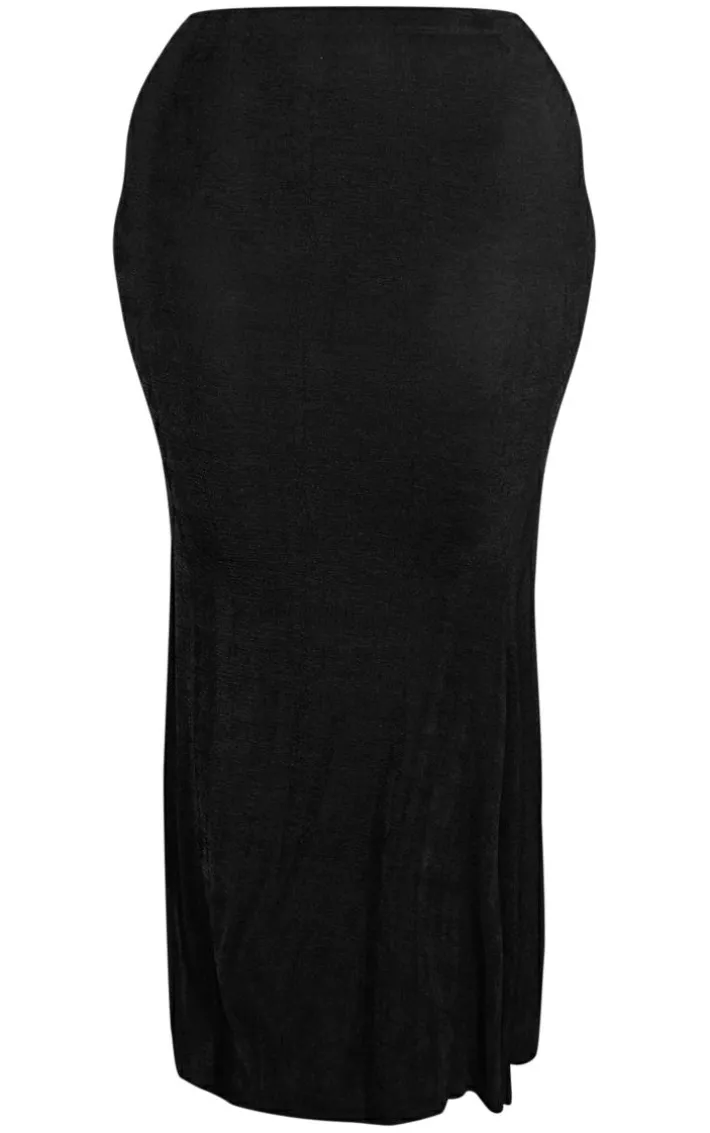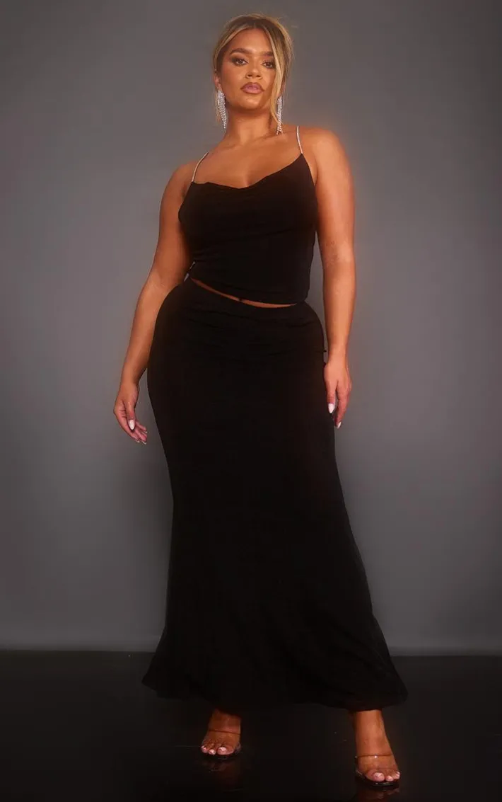 Take on your weekend the right way with this statement shape black slinky acetate low rise maxi skirt. Made from a black slinky material with an acetate low rise design, this is everything weÂ’re loving and more. With its figure-hugging fit this maxi skirt is sure to hug you in all the right places. To complete the look style this seamlessly with the matching top and some clear heels for a look that will secure you all the likes.