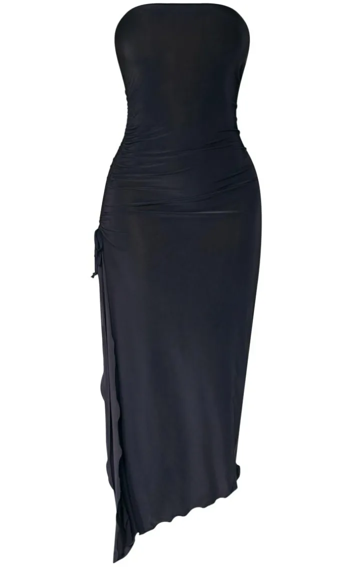 Get ready to steal all the stares in this midaxi dress. Featuring a black slinky material with a ruched side design and frill hem detailing. Style with tie-up heels and hoop earrings to bring all the attitude.