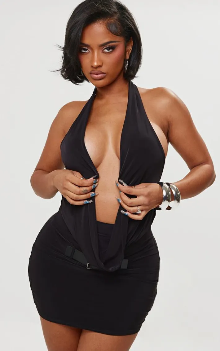 Bring all the drama to your weekend plans with this shape black slinky cowl neck buckle dress. Made from a black slinky material with a cowl neckline and buckle detailing for that extra added edge, we are obsessed. Style this black dress with knee length heeled boots and a mini bag for a look they won’t be able to take their eyes off.