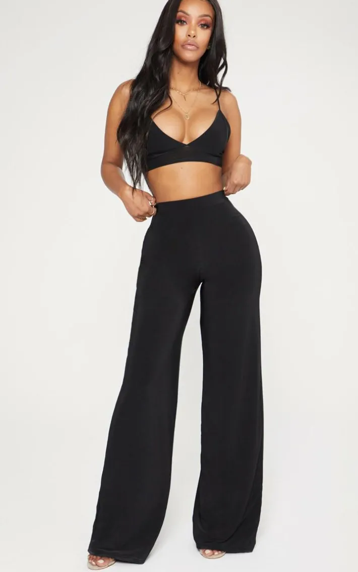 Hourglass? We got you girl. Featuring a curve-hugging black slinky material with a wide leg fit and elasticated waist, style with the matching bralet and killer heels to make heads turn.