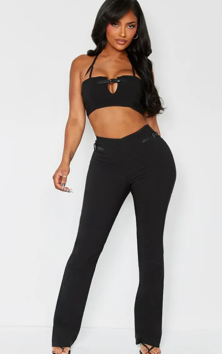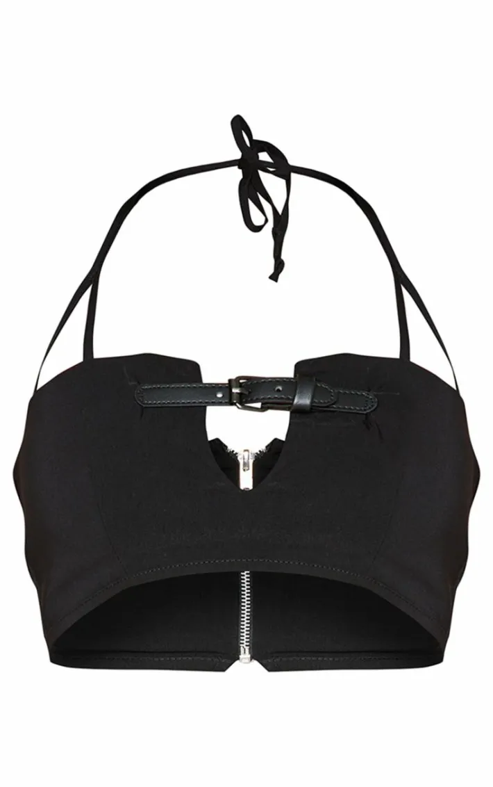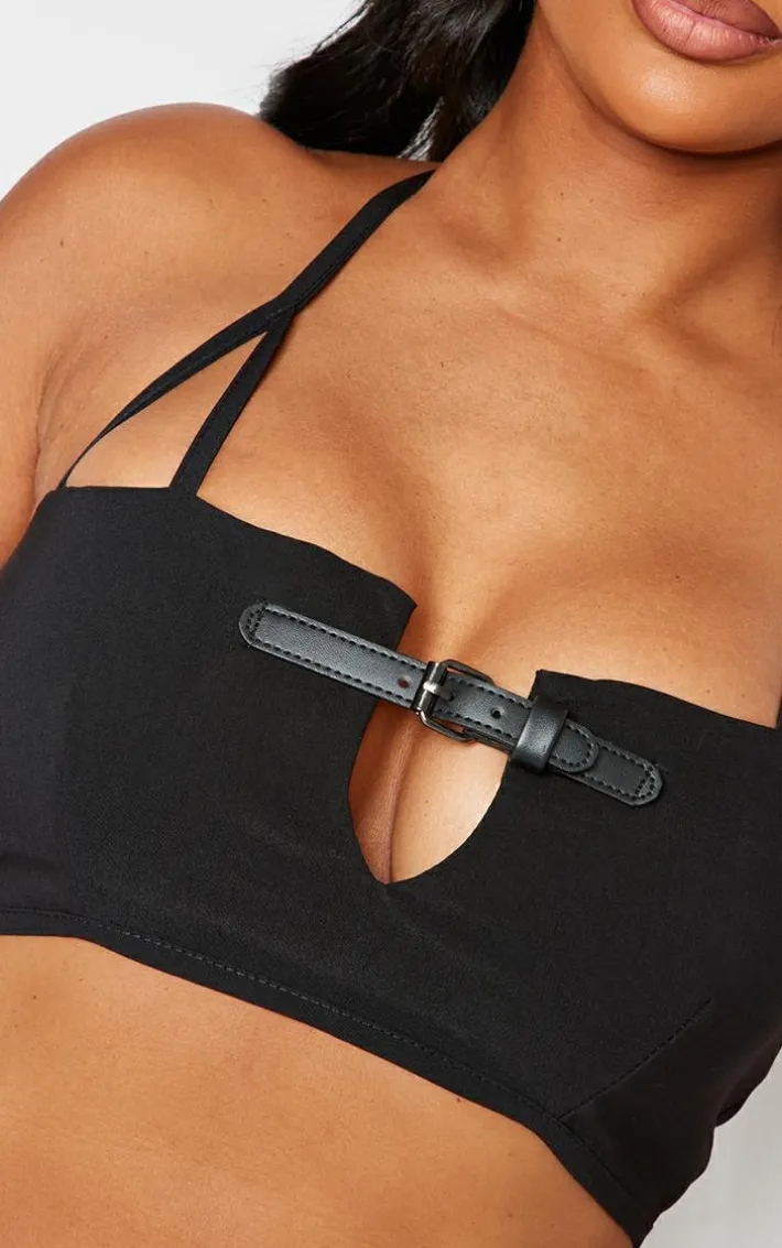 Bring all the edgy vibes this season with this shape black stretch woven buckle halterneck crop top. Brought to you in a black stretch woven material with a buckle detail and a halterneck design, what more could you want? This shape crop top is the perfect piece for those upcoming occasions in your diary. Team with a pair of wide leg pants and your go-to accessories for an Insta worthy look.