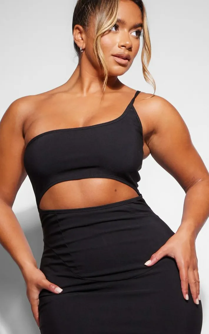 Live in the moment with this luxe dress. Featuring a black stretch woven material with a one-shoulder design, a cutout design, a midaxi length and a flattering fit, we are in love. Wear with high heels, gold accessories and a mini bag for a confidence-enhancing finish.
