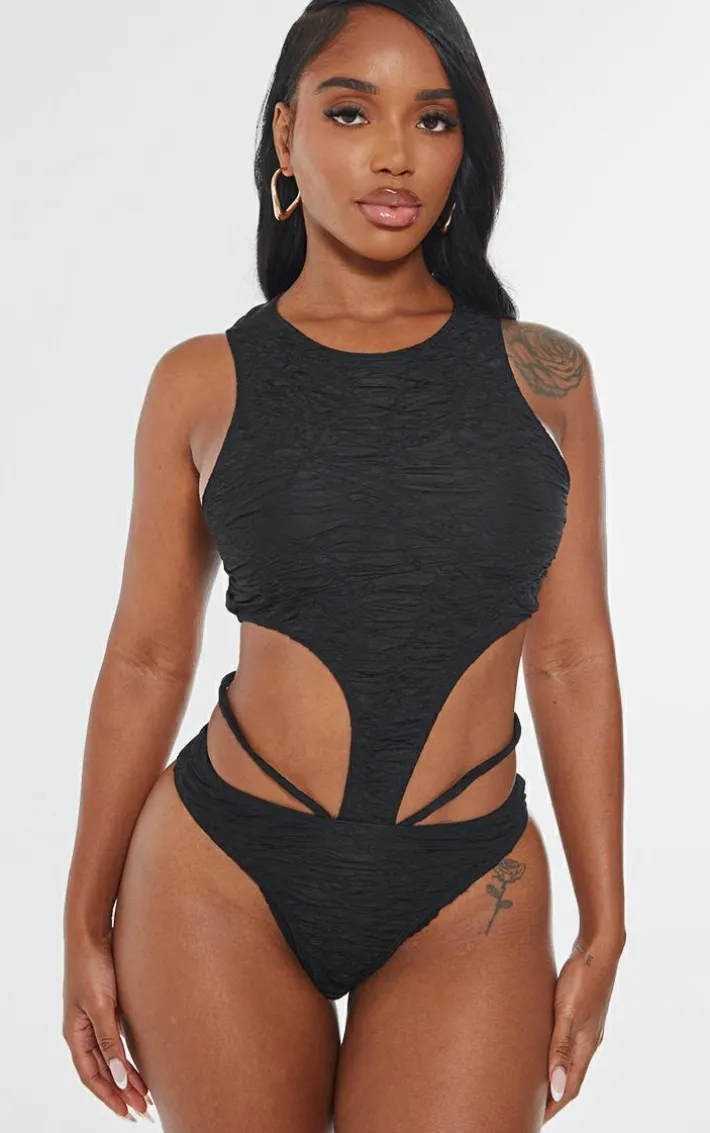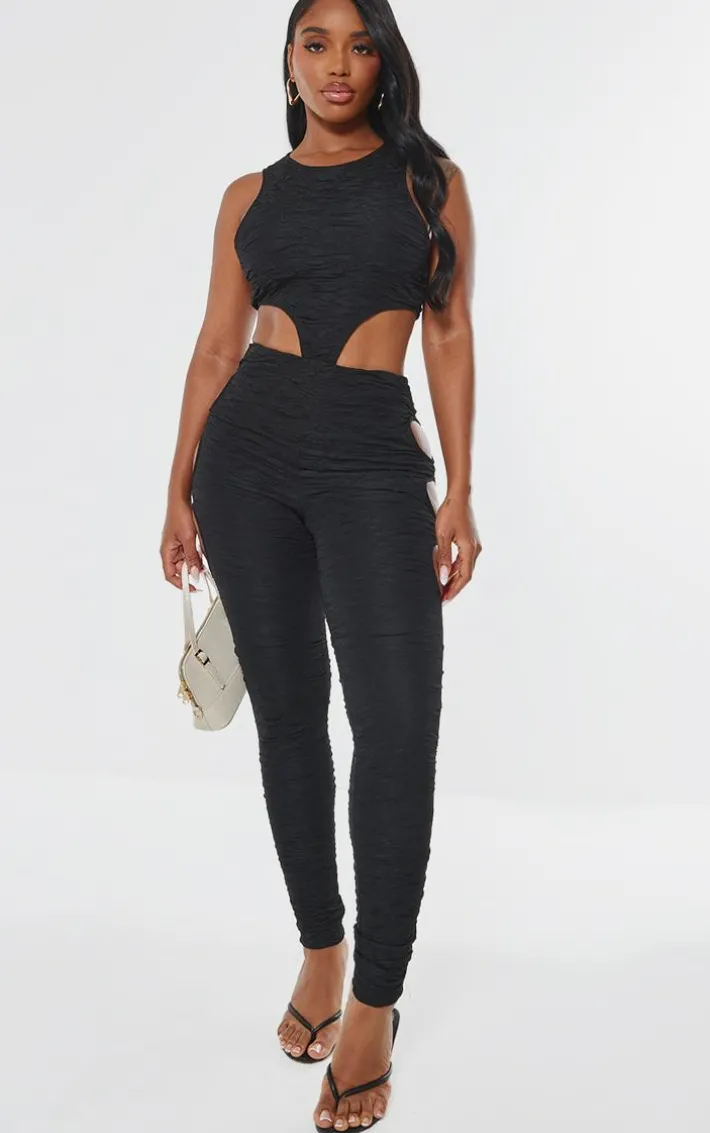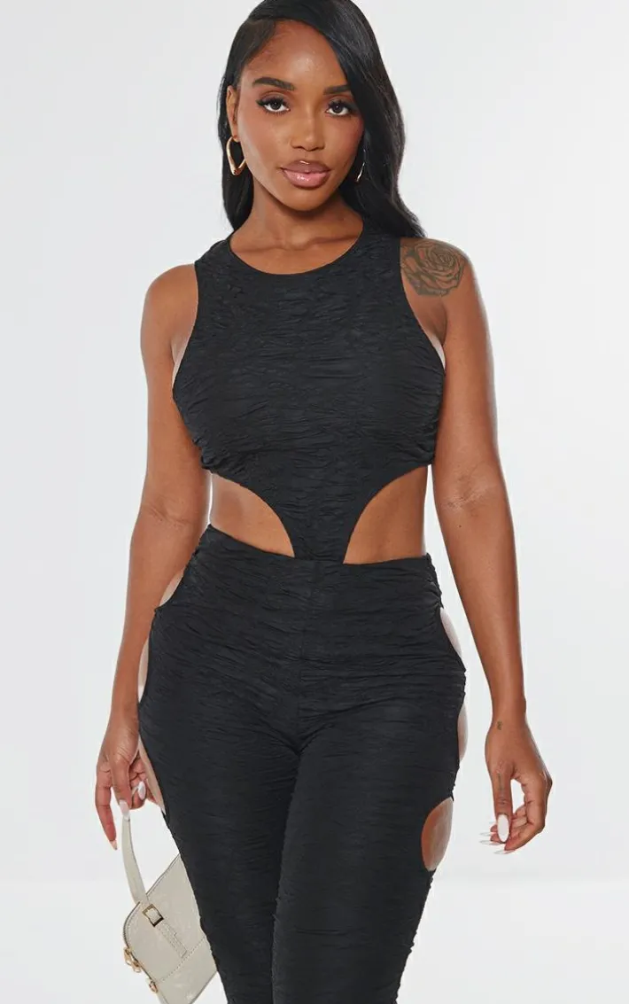 Say hello to this shape black textured cut out sleeveless bodysuit. Brought to you in a black textured material with a cut out detail and sleeveless design, this bodysuit is calling your name. Style with the matching pants, clear heels and gold accessories for a combo we’re crushing on this season.