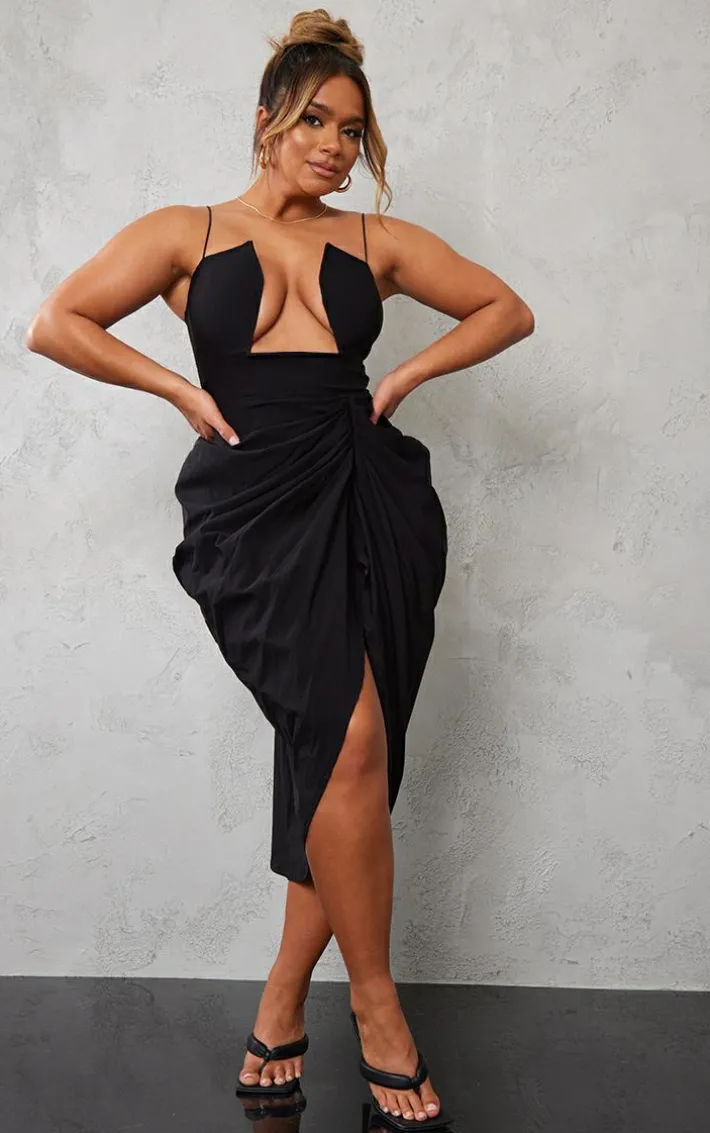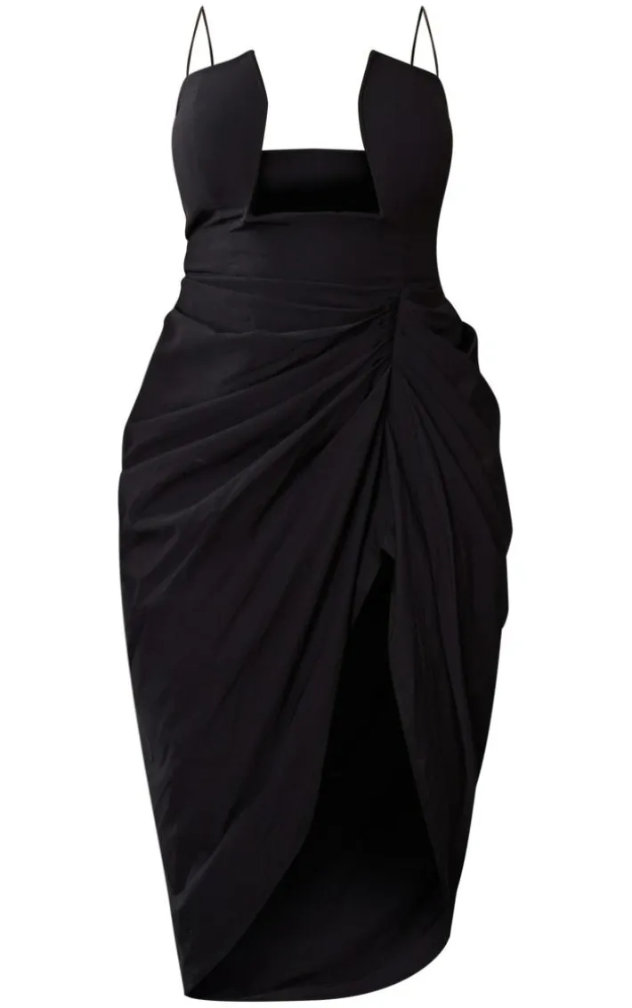 Your weekend outfit is finally sorted with this shape black woven cut out detail ruched midi dress. This dress has got you covered for any of your upcoming occasions. This black dress has a woven design with a cut out detail, we are obsessed. Simply style with some black heels a gold bag and some gold hoops to match to finish off the look that will get you noticed.