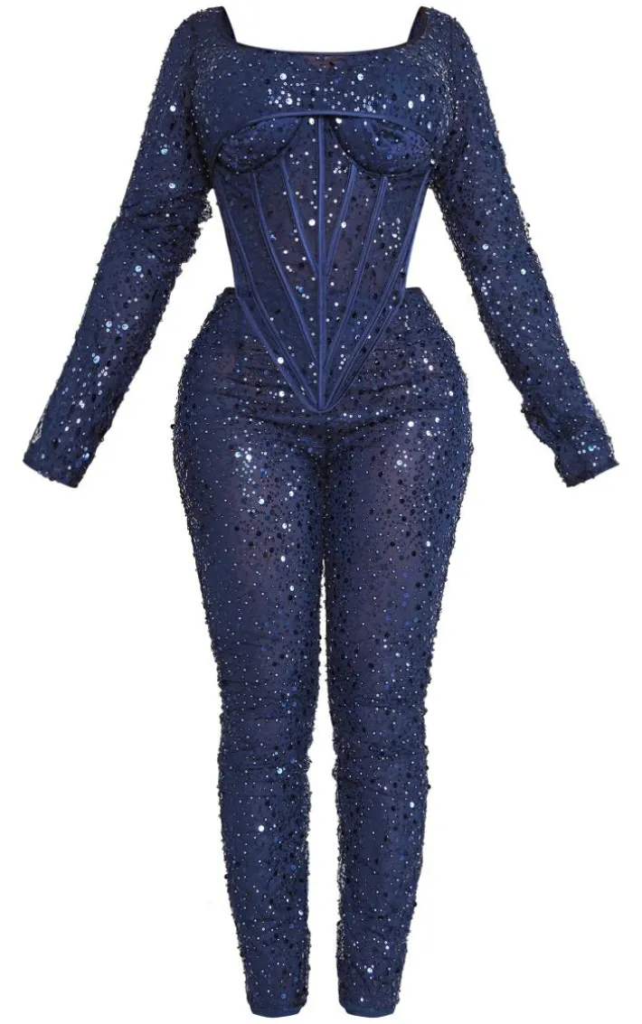 Make a statement with this shape blue sequin mesh corset detail jumpsuit. This jumpsuit is made from a blue mesh material with a sequin design, what more could you want ? Its corset detail is the ultimate must have this season and beyond. Team with some clear heels and your go-to accessories to complete the look everyone is talking about.