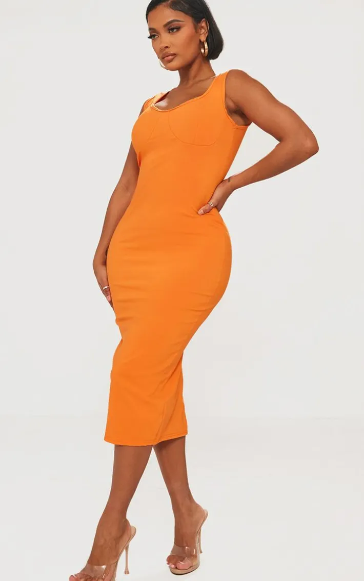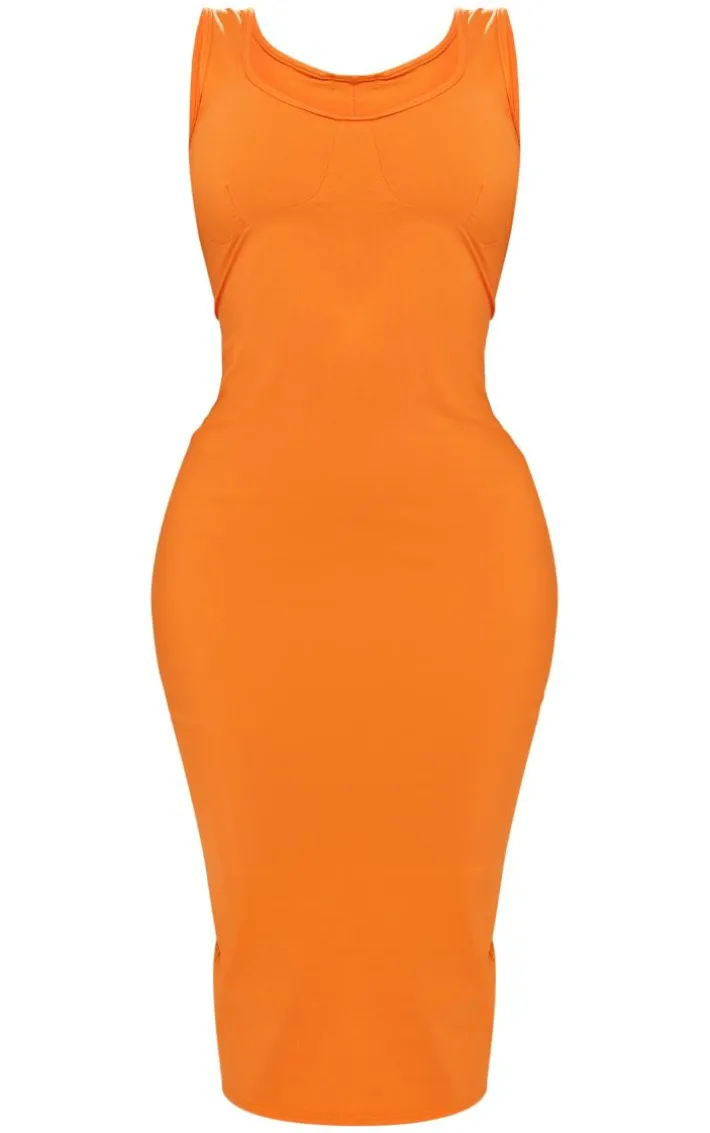 Have all eyes on you with this shape bright orange cup detail strappy midi dress. This midi dress is brought to you in a bright orange hue with cup detailing, a strappy design and a midi length, what’s not to love? This dress is calling your name. Simply style with clear high heels and gold accessories for a date night look.