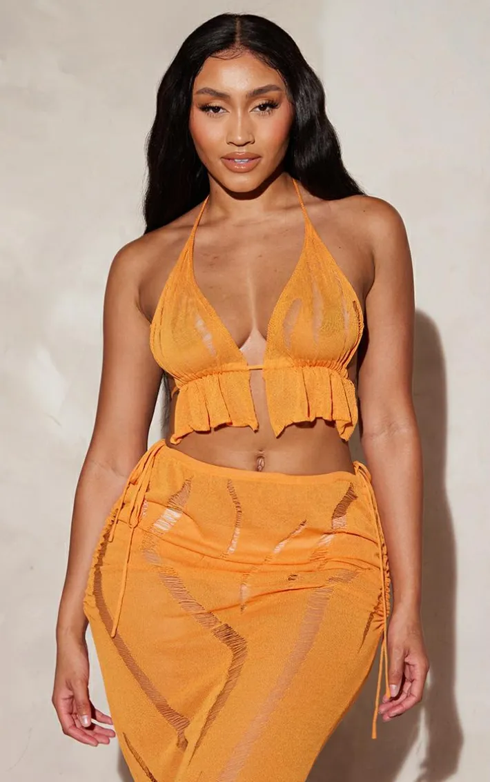 Add some statement hues to your weekend wardrobe with this shape bright orange knit ladder detailed halterneck bralette. This bralette is made from a bright orange knit material with a ladder detail that will add some edge to your look. With a halterneck design, this bralette will have you showing off your shape in all the right places. team with the matching pants and your fave accessories, its a yes from us.