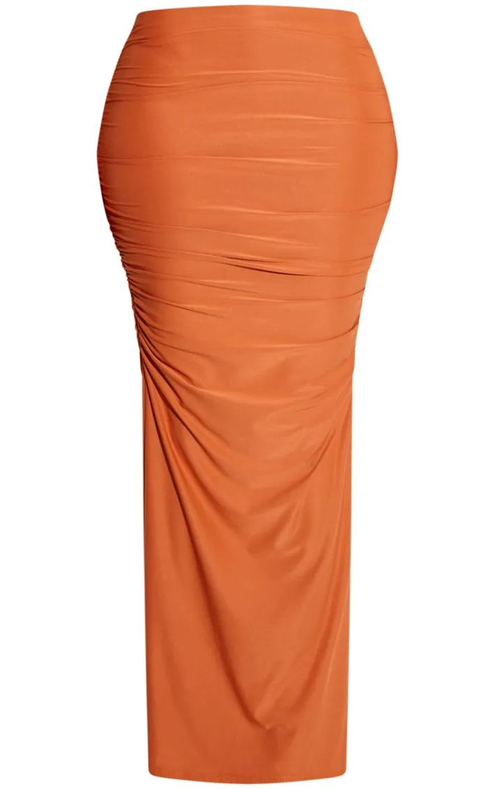 Get your glam on with this shape bright orange slinky ruched midaxi skirt. Made from a bright orange slinky material with ruched detailing and a midaxi length, youÂ’re sure to have all eyes on you. When the weekend calls so does this midaxi skirt. So what are you waiting for? Shop the look and opt for the matching top, high heels and accessories to have all eyes on you.
