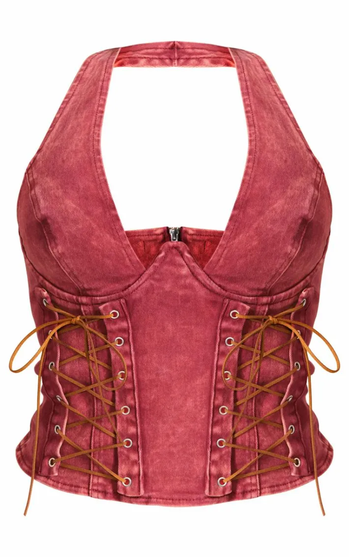 Bring all the drama to your weekend look with this shape bright red washed denim lace up corset. Made from a bright red washed denim material with a lace up design and a flattering corset fit, how can you resist? Pair this denim corset with the matching shorts and some on-trend western-style boots for a look that is sure to have all eyes on you.