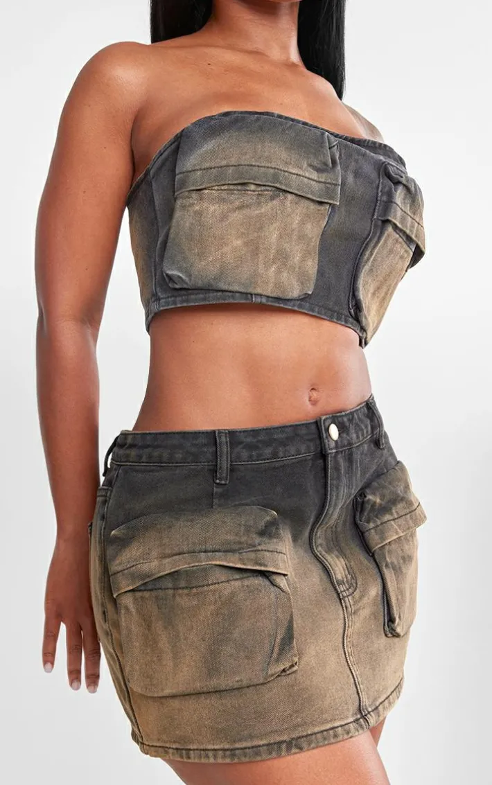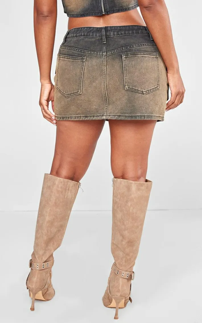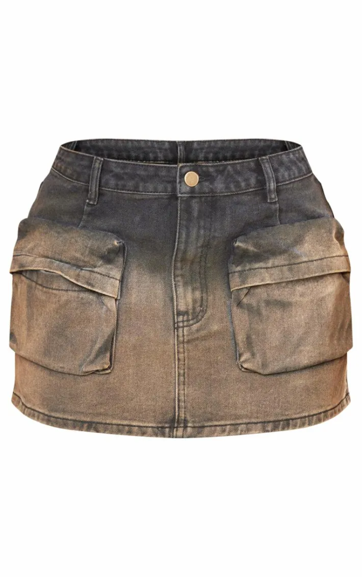 Show off your shape this season in thus shape brown denim washed pocket mini skirt. This unreal mini skirt is brought to you in a brown denim washed material with a pocket detail that will have you feeling confident. With its mini length, youÂ’ll be center of attention wherever you go. Simply style with the matching crop top and some knee high heeled boots to complete the look we are loving.