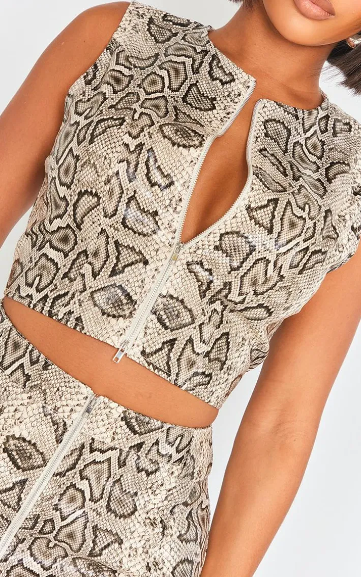 Dare to stand out from the crowd in this shape brown faux leather snake print zip front top, we’re seriously in love. Made using a brown faux leather material with a snake print and a zip front design, it’s a definite yes from us. Style this shape faux leather top with the matching skirt, high heels and minimal accessories for a next level look.