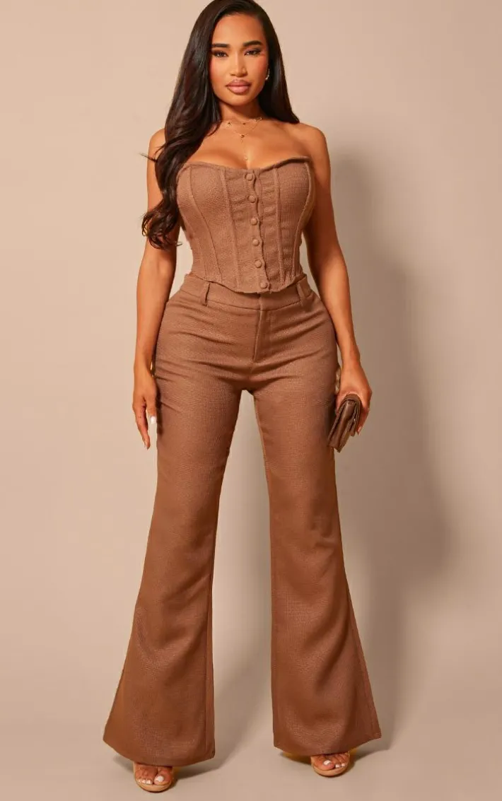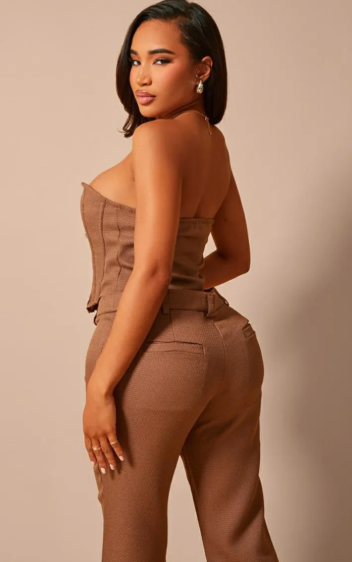 Get your glam on with this shape brown woven hook and eye corset. Made from a brown woven material with a hook and eyes design, youÂ’re sure to have all eyes on you. When the weekend calls so does this corset. So what are you waiting for? Shop the look and opt for the matching bottoms, high heels and accessories for a glam finish.