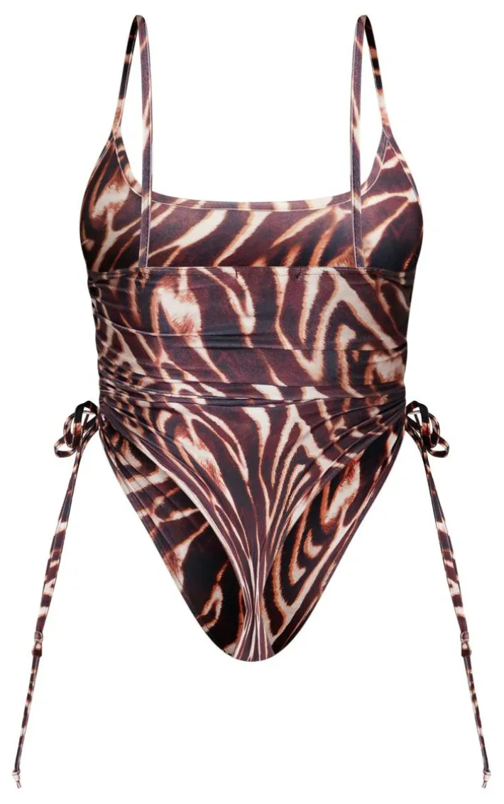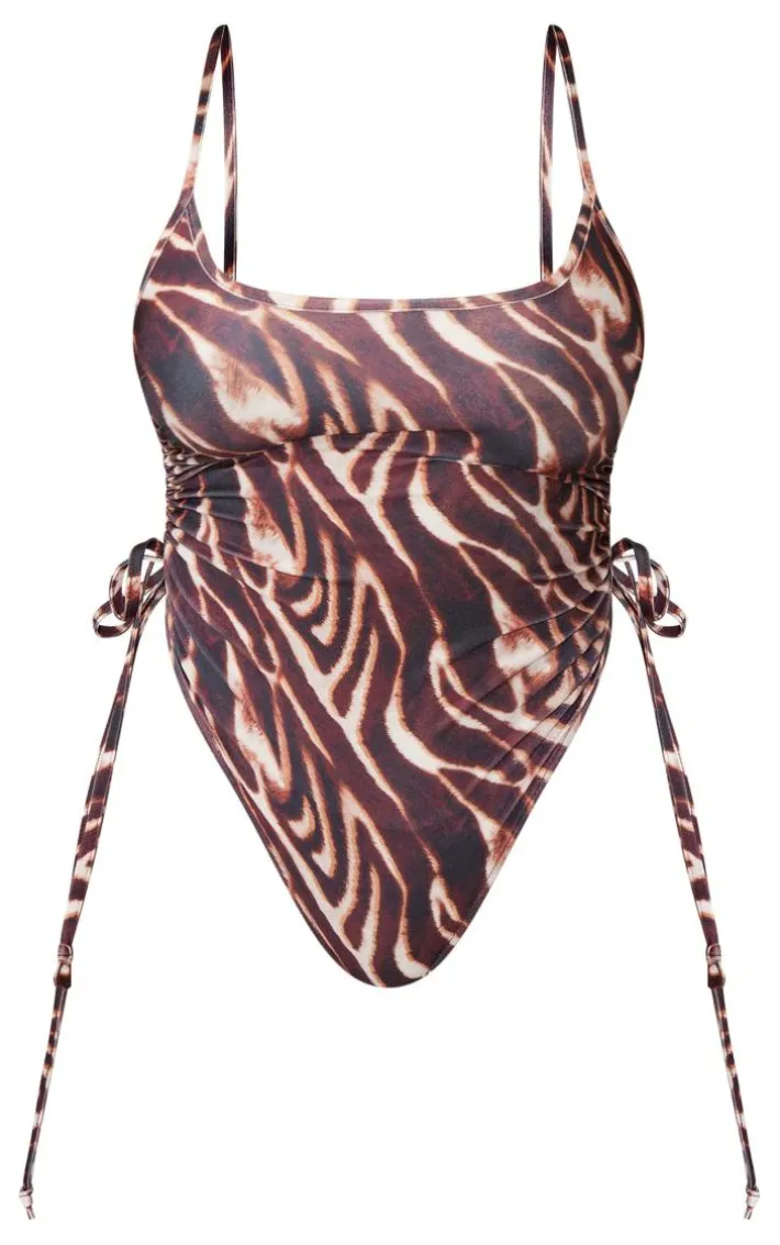 Get ready to soak up the good vibes this season. Featuring a brown zebra print material with a ruched side and high-rise fit, we are obsessed. Pair with sunnies and gold hoops for a minimalistic finish.