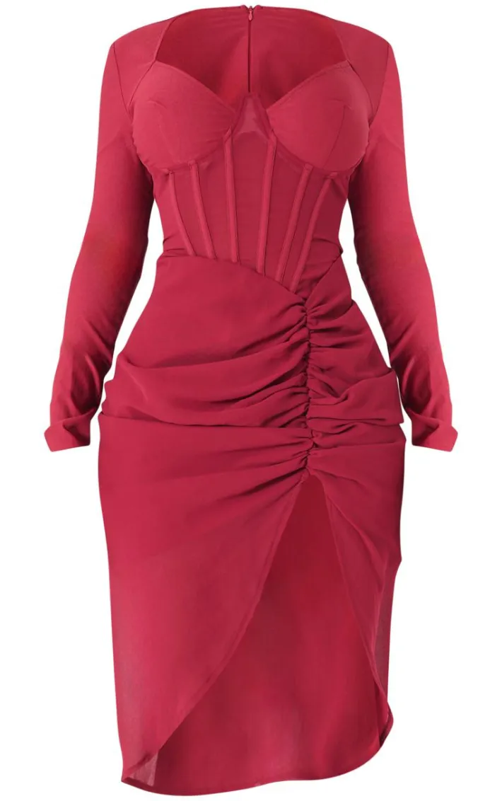 When the weekend calls for a little drama this shape burgundy corset long sleeve ruched midi dress will have you at the center of attention. It is made using a burgundy material with a corset design, long sleeves and ruched detailing, what more could you want ? Style this midi dress with clear slip-on heels and statement accessories to elevate the look further.