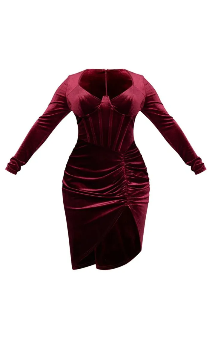 Got a special occasion coming up ? Then this shape burgundy velvet corset detail long sleeve ruched midi dress will tick all the boxes. It is made using a burgundy velvet material with a ruched design and long sleeves. Style this shape midi dress with your fave heels and simple accessories for a dreamy date night look, we’re obsessed.