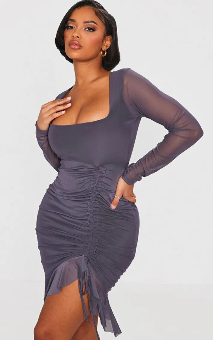 Give your wardrobe the update it deserves with this shape charcoal mesh long sleeve ruched side frill hem bodycon dress. Brought to you in a charcoal mesh material with a long sleeve design, what’s not to love ? Its ruched side and frill hem will have you tapping into your feminine side no matter what. Team with a pair of heels and your go-to accessories for a fool proof finish we are obsessing over.