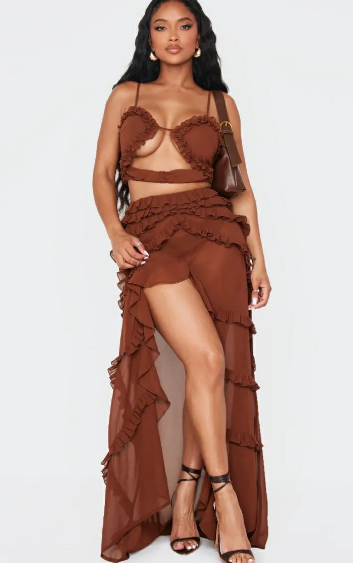 Take a chance on this shape chocolate low rise frill detail front split maxi skirt for a look you won’t regret. Brought to you in a seasonal chocolate tone, with a flattering low rise fit, frill detail and a front split design, we know you’ll be looking and feeling your most confident. Team with a pair of strappy heels and gold accessories to complete the look.