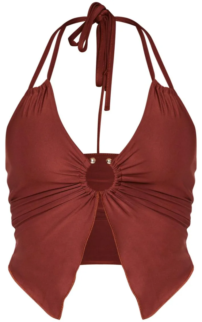 Bring all the drama to your weekend look with this shape chocolate slinky halterneck ring detail crop top. Made from a chocolate slinky material with a halterneck design, ring detailing and a cropped fit, we are obsessed. Style this slinky top with wide leg pants and heels for a look that is sure to have all eyes on you this weekend.