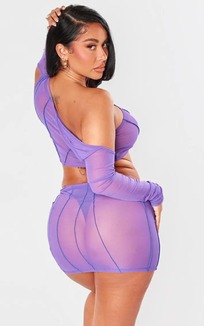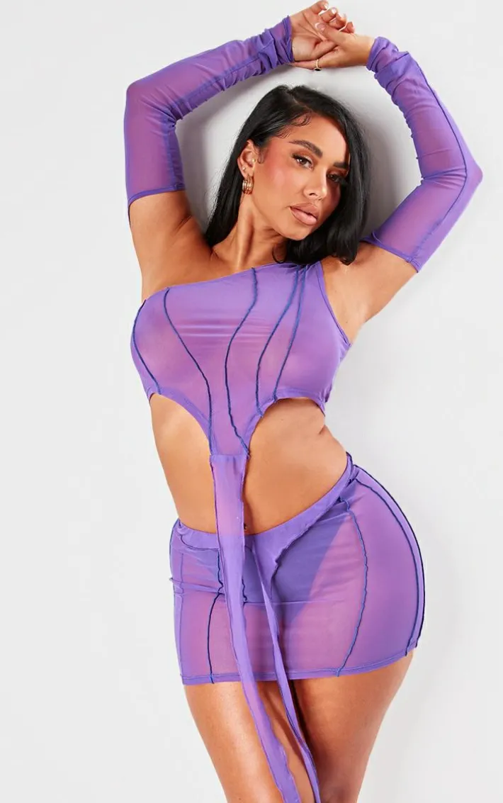 When the weekend calls for a little drama this shape dark purple mesh seam detail one shoulder crop top is a must-have. It is made using a dark purple mesh material with a one shoulder design and seam detailing. Style this mesh top with the matching skirt, barely there heels and hoop earrings for a look no one will forget.