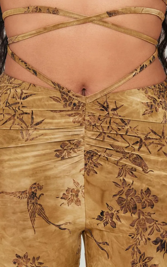 The new you starts here, opt for these shape green devore dipped waist ruched pants. Brought to you in a seasonal green hue, with a devore design, flattering dipped waist cut and ruched finish, what more could you want? Pair with the matching top and burgundy hue heels to complete the look.