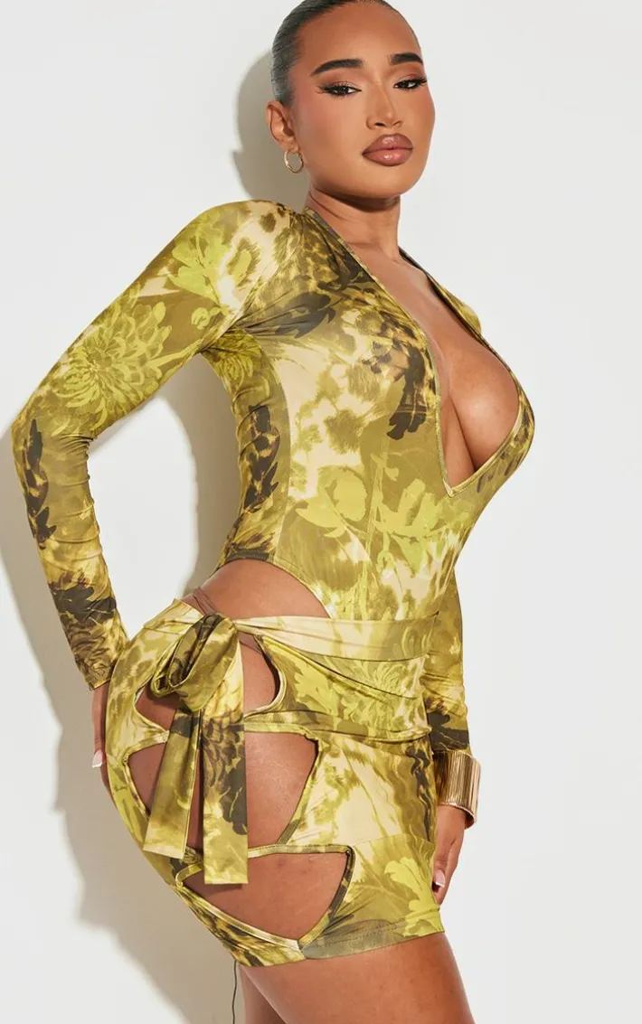 Inject some statement prints into your weekend wardrobe with this shape green floral animal printed slinky cut out tie detail mini skirt. Brought to you in a green hue slinky material with a floral animal print design, cut out detailing and a mini fit, how can you resist? Pair this mini skirt with the matching top, heels and gold accessories for a look that is sure to make you stand out from the crowd.