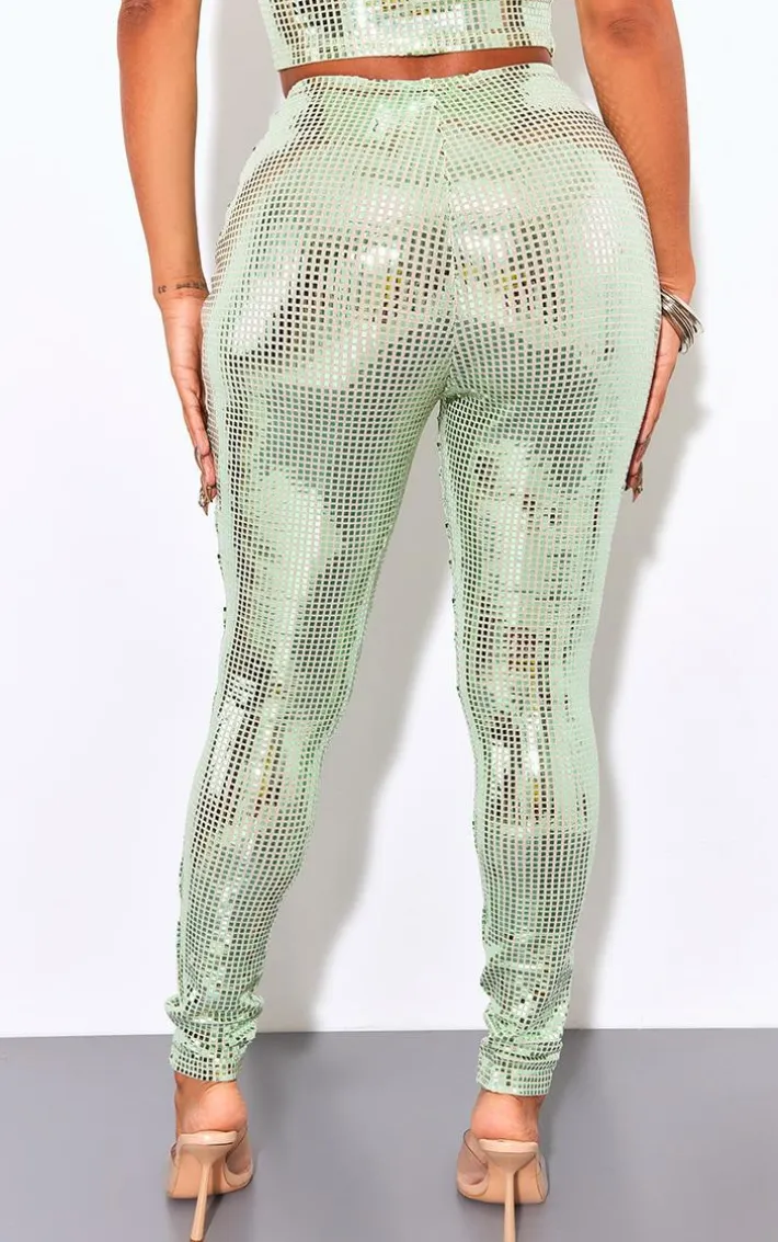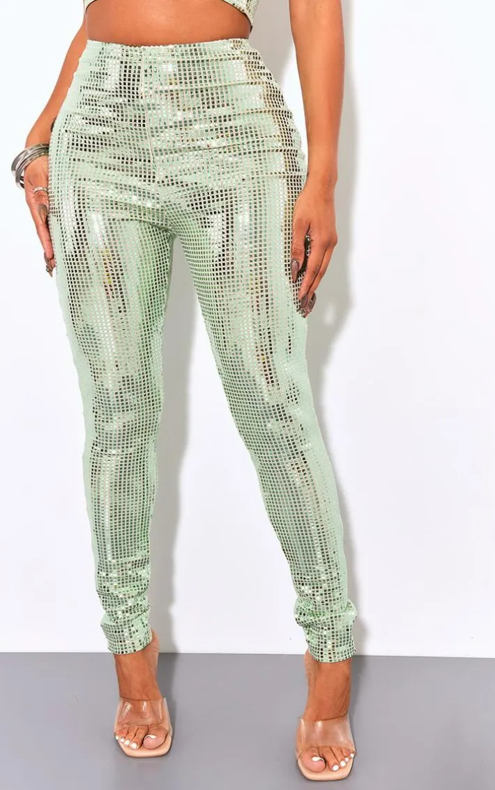 Be prepared to turn heads for all the right reasons this weekend with these shape green mirrored sequin leggings. Brought to you in a green mirrored sequin material with a high waist and a figure-hugging fit, how could you say no? These shape leggings are sure to bring all the glam vibes to your look and we’re obsessed. Shop the look and team with the matching bandeau, clear heels and gold accessories for a statement finish.