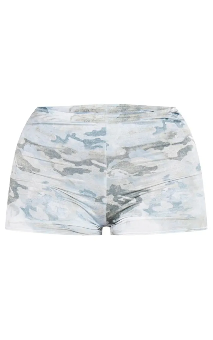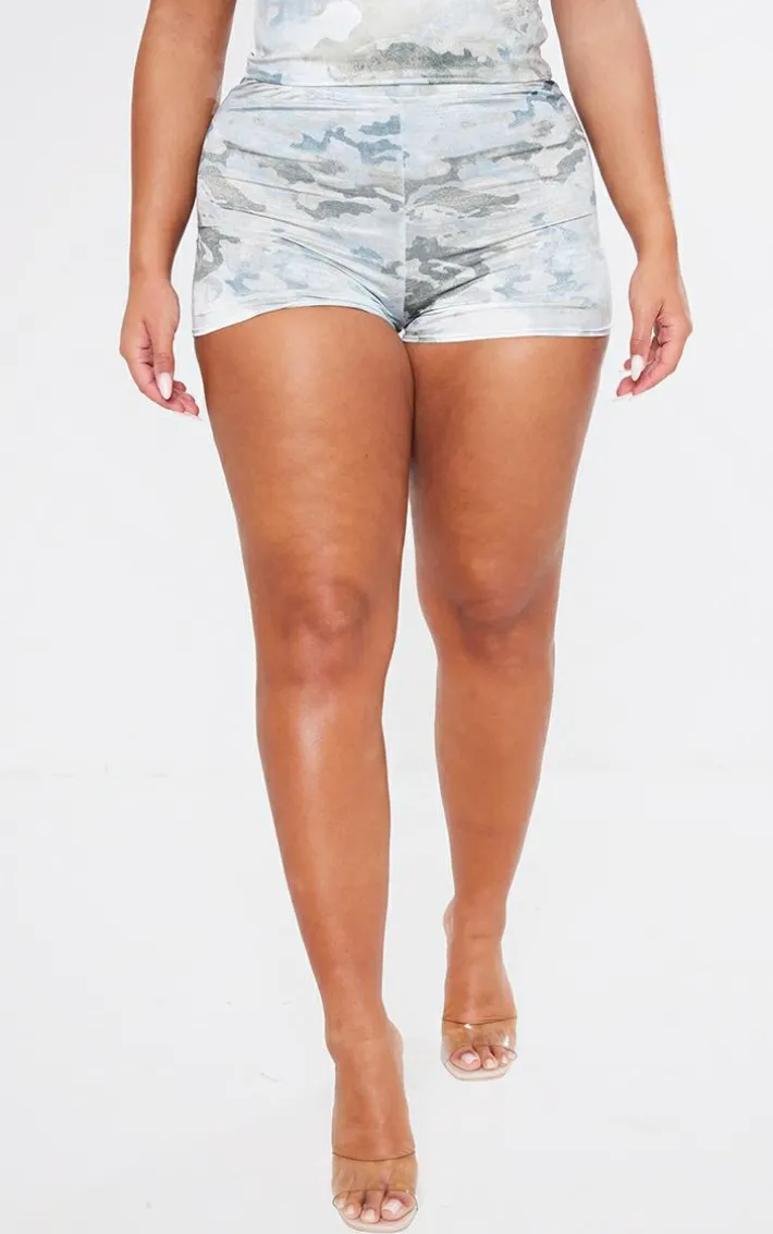 Say hello to your new season staple with this shape green slinky camo print low rise hot pants. These hot pants are brought to you in a green slinky camo print material with a low rise and a figure-flattering fit, how could you say no? Style effortlessly with the matching top, clear high heels and accessories for a look that will turn heads for all the right reasons.