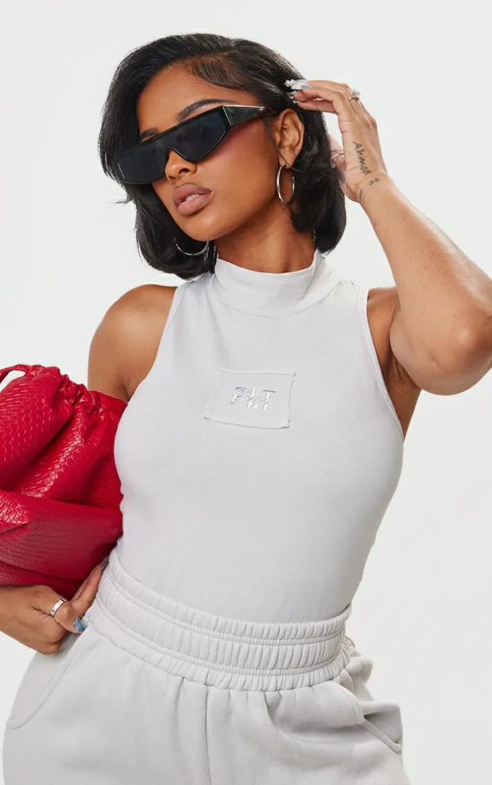 Give your basics collection a new season glow up with our shape grey cotton high neck sleeveless bodysuit. Brought to you in a cotton material for ultimate comfort, a high neck and sleeveless shape with a square embroided detail, what’s not to love? Pair with some wide leg sweatpants, heels and a statement bag to make heads turn for the right reasons.