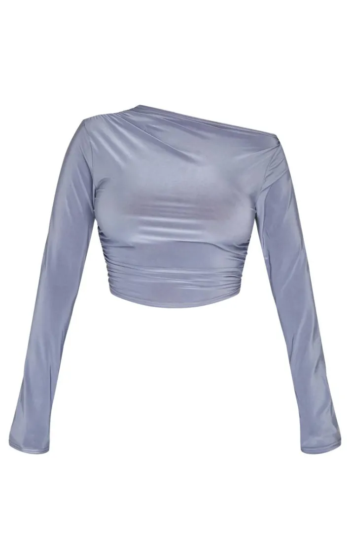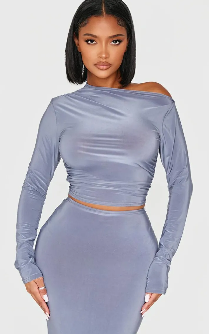 Add this shape grey ruched off shoulder long sleeve top to your collection. Brought to you in a versatile grey shade, with a luxe ruched material and off the shoulder design, this top can effortlessly be dressed up or down to suit your plans. Team with the matching skirt and simple accessories for a finish like no other.