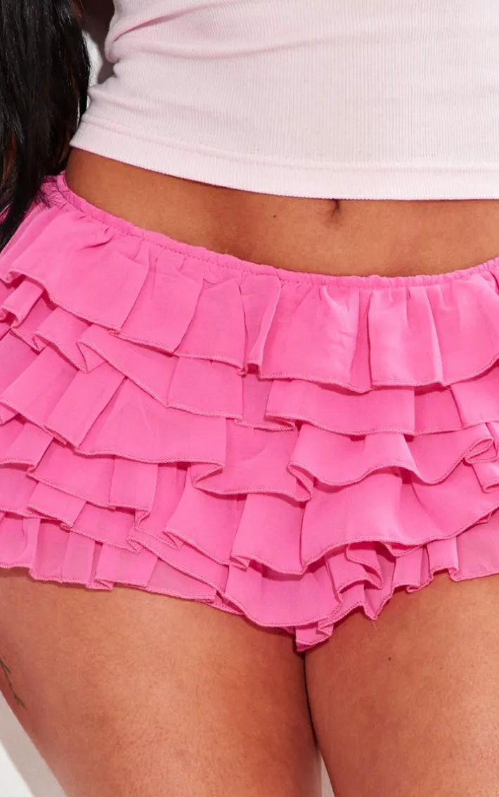 Calling all curvy s, you’ll look unreal in these shape hot pink chiffon ruffle low rise hot pants. Brought to you in a hot pink chiffon material with a ruffle design and low rise detail, these hot pants are at the top of our wish list. Style with a white tee, white heels and silver mini bag for a glam finish.