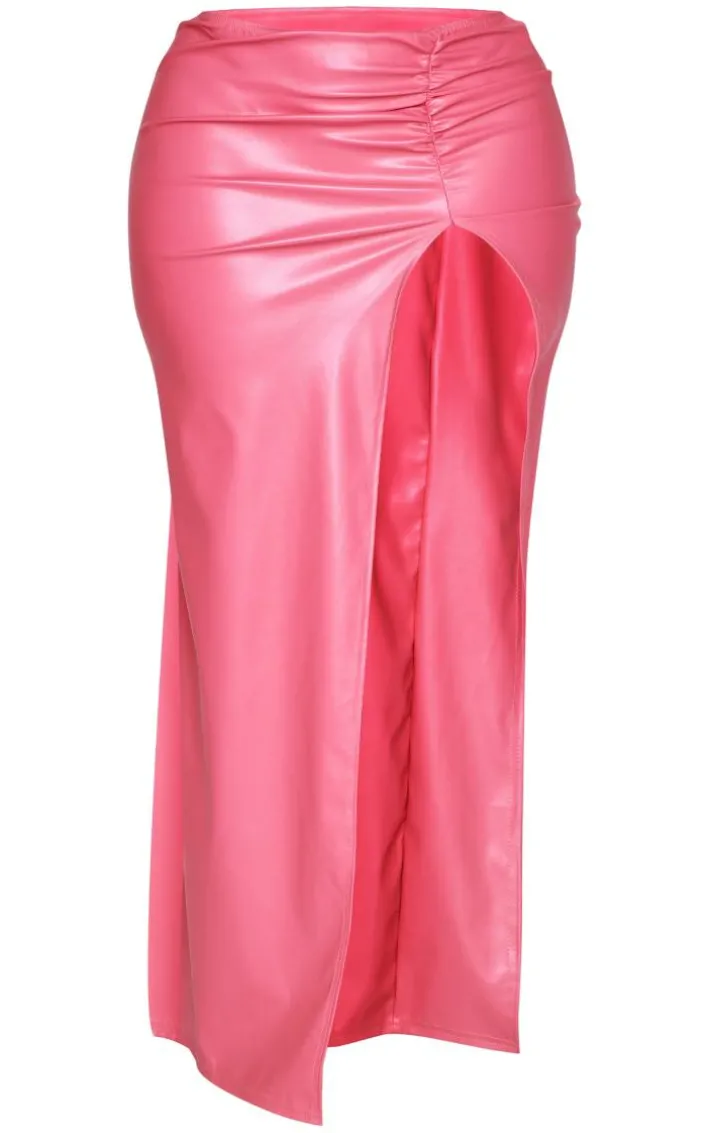 This shape hot pink faux leather ruched high leg skirt is sure to take your weekend look to a whole new level. Brought to you in a hot pink hue faux leather material with a ruched design and a high leg split, how can you resist? We are loving this high leg skirt styled with the matching top, strappy heels and a mini bag for a look that is sure to make you stand out from the crowd.