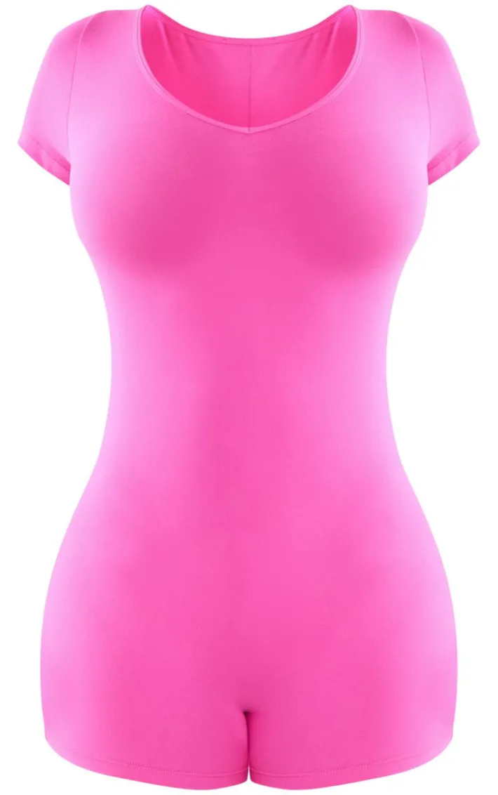 Stand out from the crowd in this shape hot pink sculpted plunge V neck short sleeve unitard. Brought to you in a hot pink sculpted material with a plunging V neckline, short sleeves and a figure-flattering fit, what more could you want? Dress this hot pink unitard up with heels or down with sneakers to suit your plans.