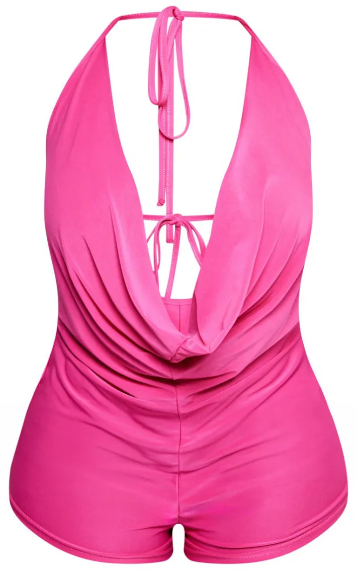 Set major trends this season with this shape hot pink slinky halterneck cowl panties unitard. Brought to you in a hot pink slinky material with a halterneck cowl design, what more could you want ? Its panties detail will have you feeling effortlessly chic all season long. Team with your fave accessories and your fave heels for a fool proof finish we are obsessing over.