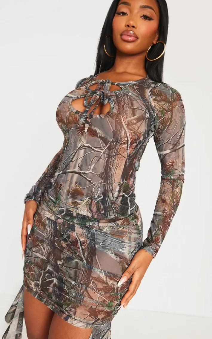 Bring some drama to your weekend look with this shape khaki abstract camo printed cut out long sleeve top. Made from a khaki hue material with an abstract camo print design, cut out detailing and long sleeves, we are obsessed. Pair this shape top effortlessly with the matching skirt, heels and gold accessories for a look that is sure to make heads turn all night long.