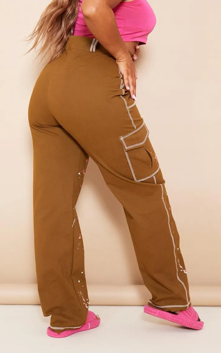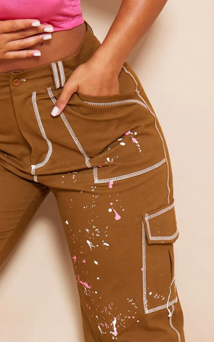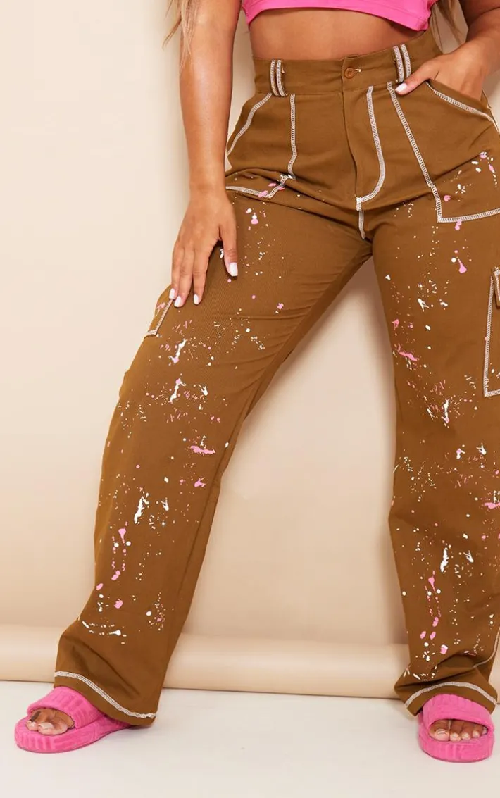 Switch up your style game with these bottoms. Featuring a khaki hue material with a contrasting stitch design, paint splatter detailing and a cargo style. Wear with a hot pink top and slides for a look that will have heads turning.