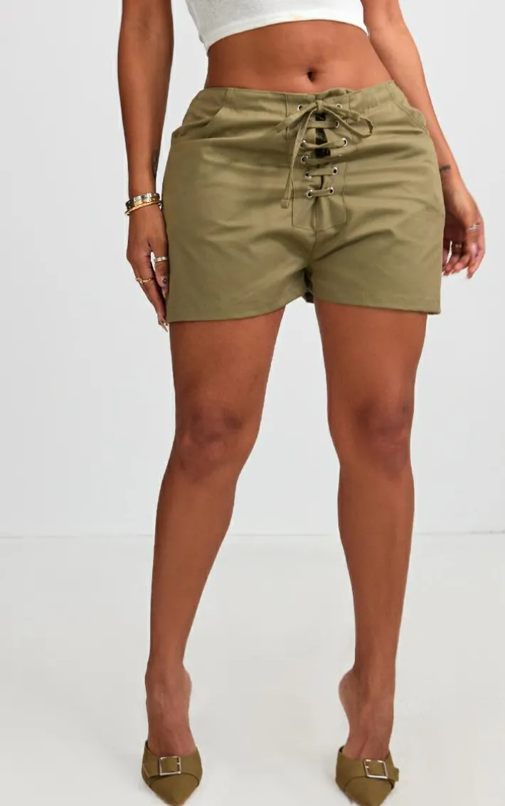 Add some flare to your wardrobe with these shape khaki lace up front twill shorts. Brought to you in a khaki twill material featuring a lace up front design, what’s not to love? Style these shorts with a white tee, heels and gold accessories for brunch , it’s a yes from us.