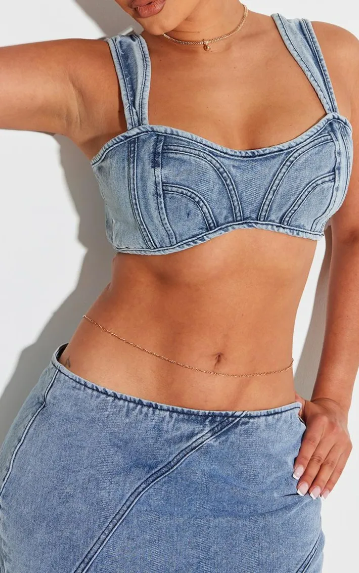 Say hello to your new season staple with this shape light blue denim seam bralet. Brought to you in a light blue denim material with a seam detail, what more could you want? This shape bralet is here to banish any of your what to wear dilemmas. Simply style with the matching skirt and a pair of heels for a look that has you being the topic of everyone’s conversation.