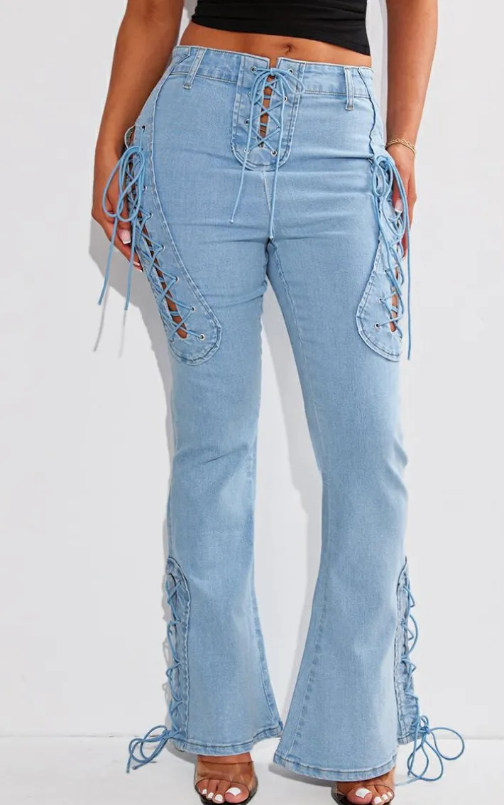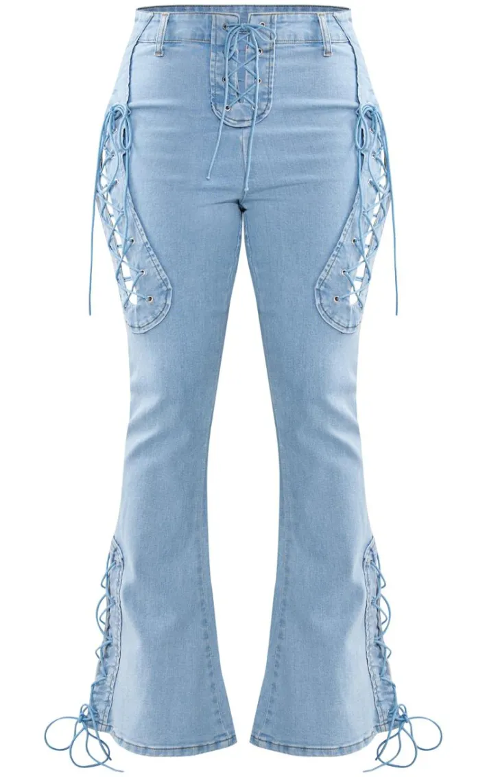 Be on trend this season with these shape light blue stretch denim lace up flare jeans. Brought to you in a light blue denim stretchy material with a lace-up design and a flared fit, you will bring all the edge to your outfit of the day. These jeans are perfect for those on the go days. Team with a crop top, high heels and accessories to be the center of attention wherever you step foot this season.