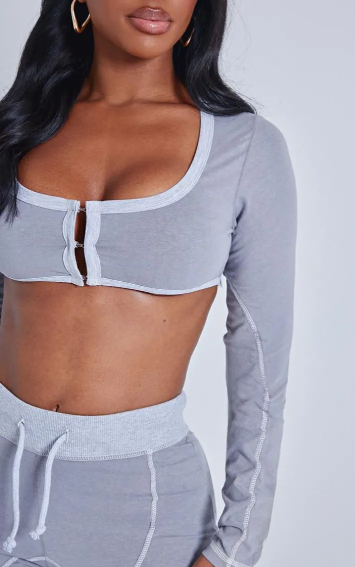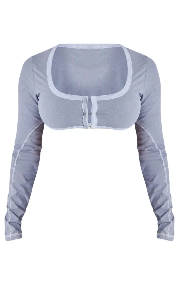 Switch up your weekend style game with this shape light grey washed cotton hook and eye long sleeve crop top. Brought to you in a light grey washed cotton material with long sleeves, hook and eye detailing and a cropped fit, what more could you want? Style this crop top with the matching bottoms, heels and gold accessories for a look that will have eyes on you for all the right reasons.