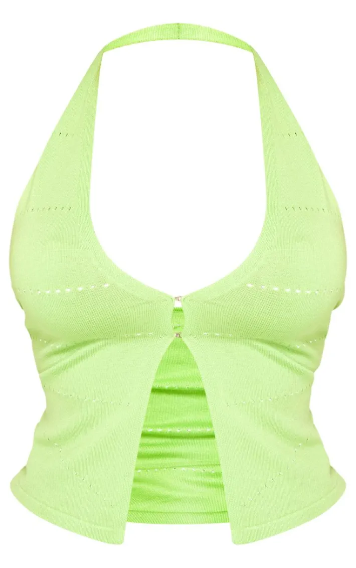 For an Insta worthy look, this shape lime knit hook and eye halterneck plunge top is essential. This unreal plunge top is made from a lime knit material with a hook and eye fastening giving you a flattering fit you wonÂ’t be able to resist. Its halterneck design will have you feeling chic all season. Why not team with the matching skirt and your fave accessories to complete the look everyone is talking about.