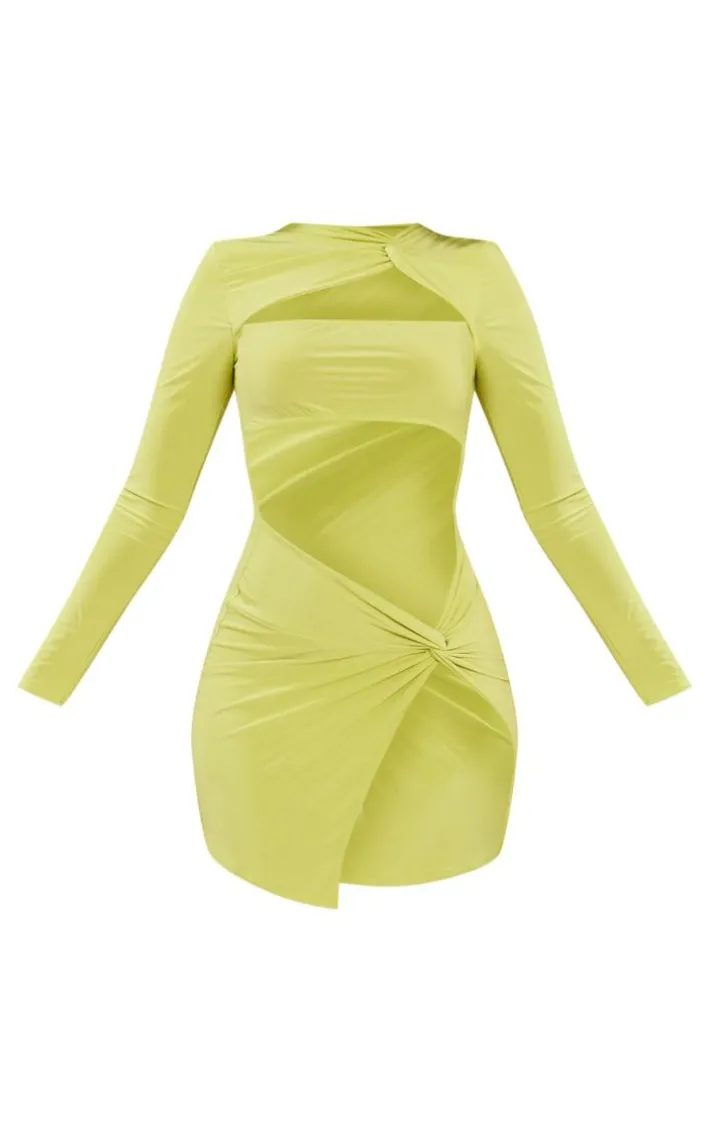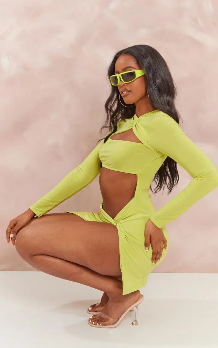 Say hello to your new weekend staple with this shape lime slinky knot detail cut out mini dress. This mini dress is brought to you in a lime slinky material with knot detailing and a cut-out waist, what more could you ask for? This mini dress with it’s statement hue will have all eyes on you. Pair with your clear high heels and gold accessories for a look like no other.