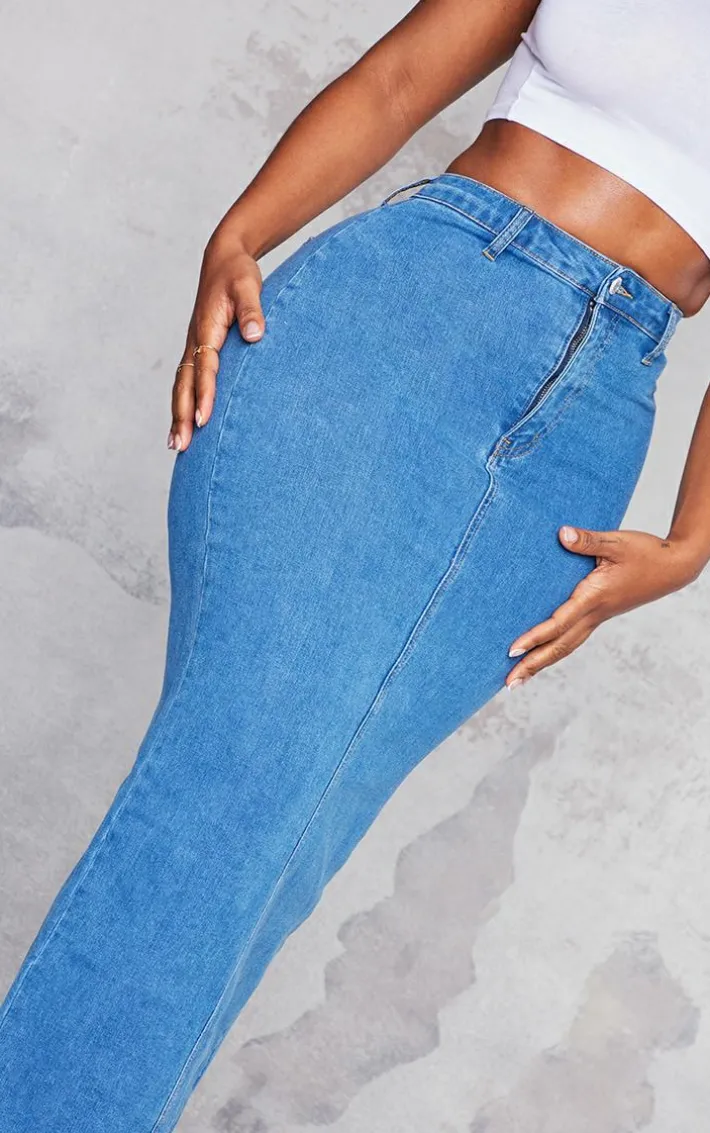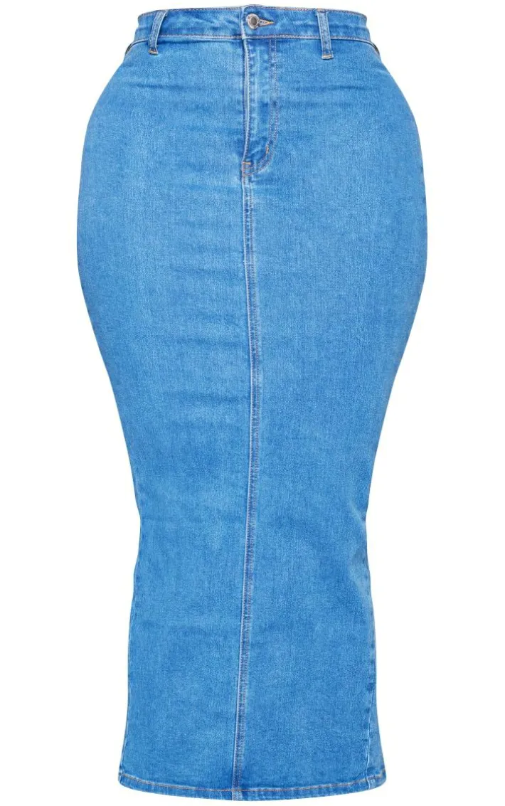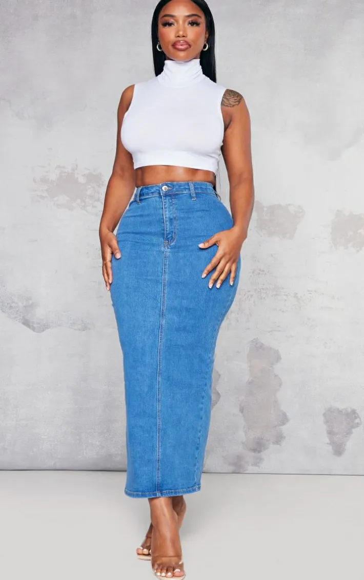 Make a statement with this skirt. Featuring a mid denim blue wash disco material with a midaxi length and a figure-hugging fit, what’s not to love? Wear this with a white crop top, clear high heels and accessories for a look we can’t stop crushing on.