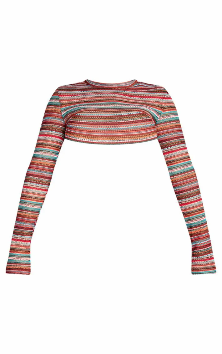 Tap into your confident side with this statement shape multi contrast textured long sleeve extreme crop top. Brought to you in a multi hue textured material with long sleeves and an extreme cropped length, you’ll be adding this shape top straight to your basket. To elevate the look further just add the matching skirt, heels and a bold hue bag, what are you waiting for?